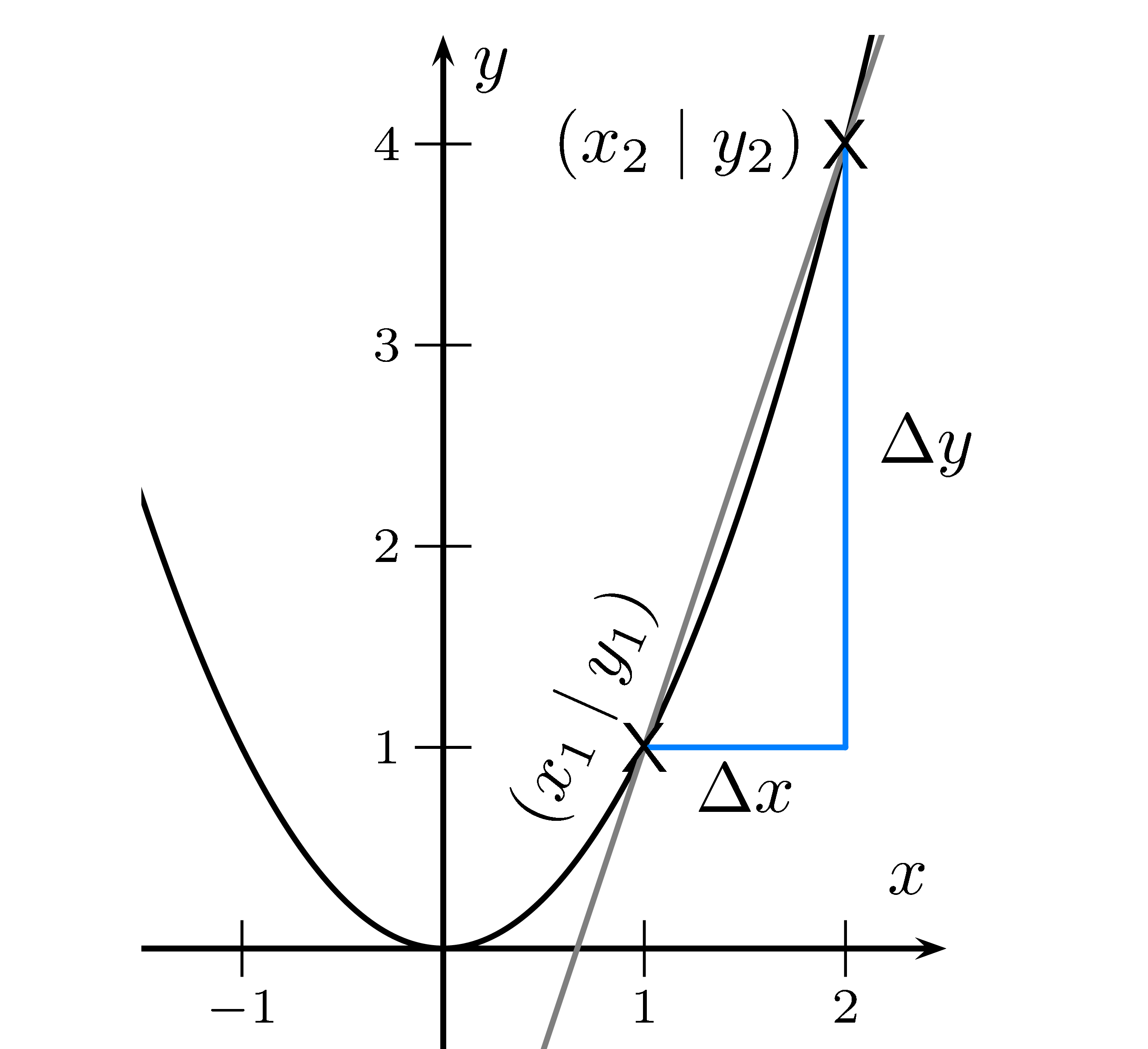 Den Differential-Quotient ist also der Grenzwert von $m=\dfrac{y_2-y_1}{x_2-x_1}$, für $x_2\rightarrow x_1$.