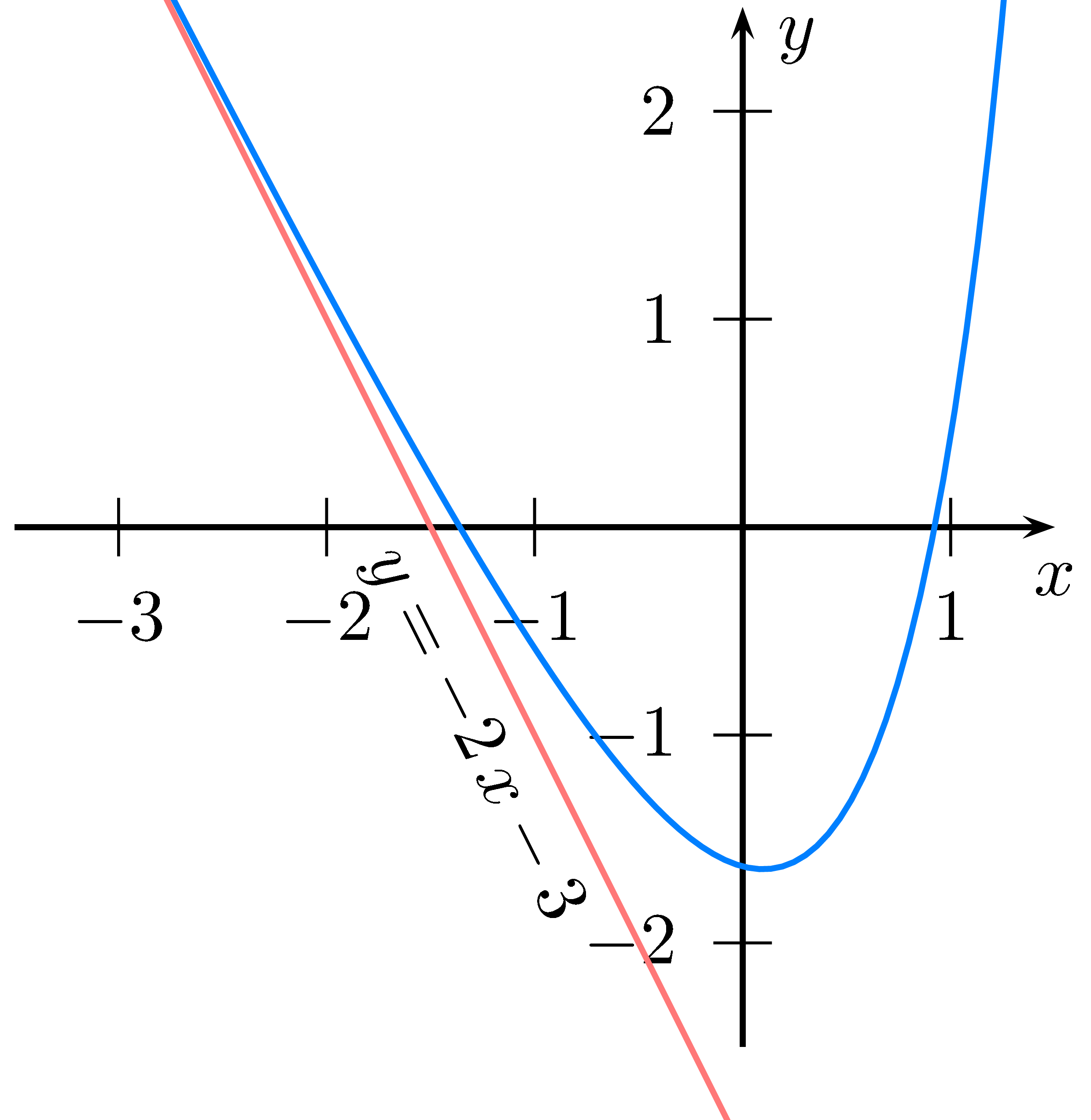 Schaubild von $f(x)=e^{2x-1}+e^{x}-2x-3$ und seine Asymptote $y=-2x-3$