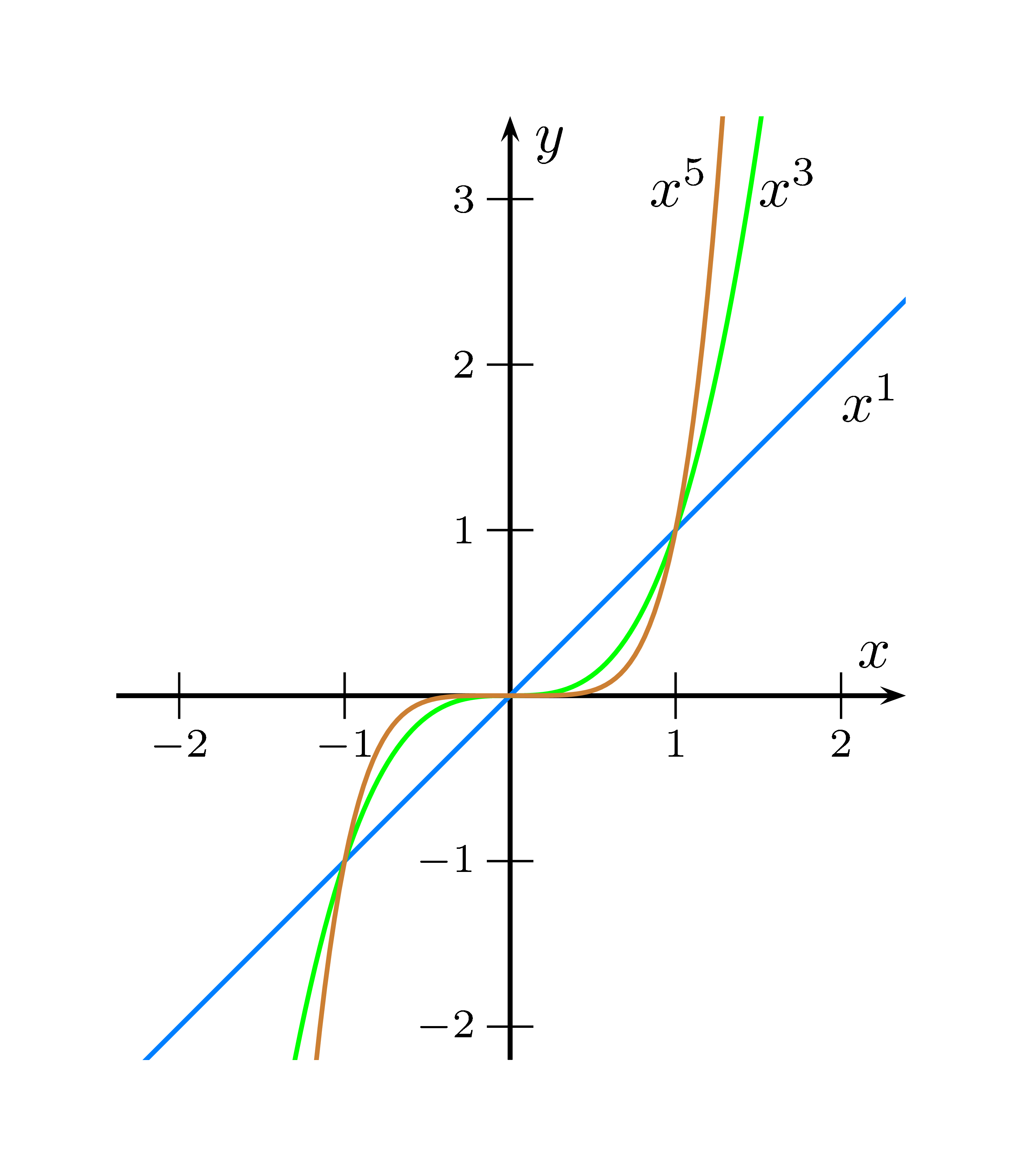 Alle Potenz-Funktionen mit ungeraden Exponenten, also $n=1; n=3; n=5; \ldots$ haben viele gemeinsame Eigenschaften: