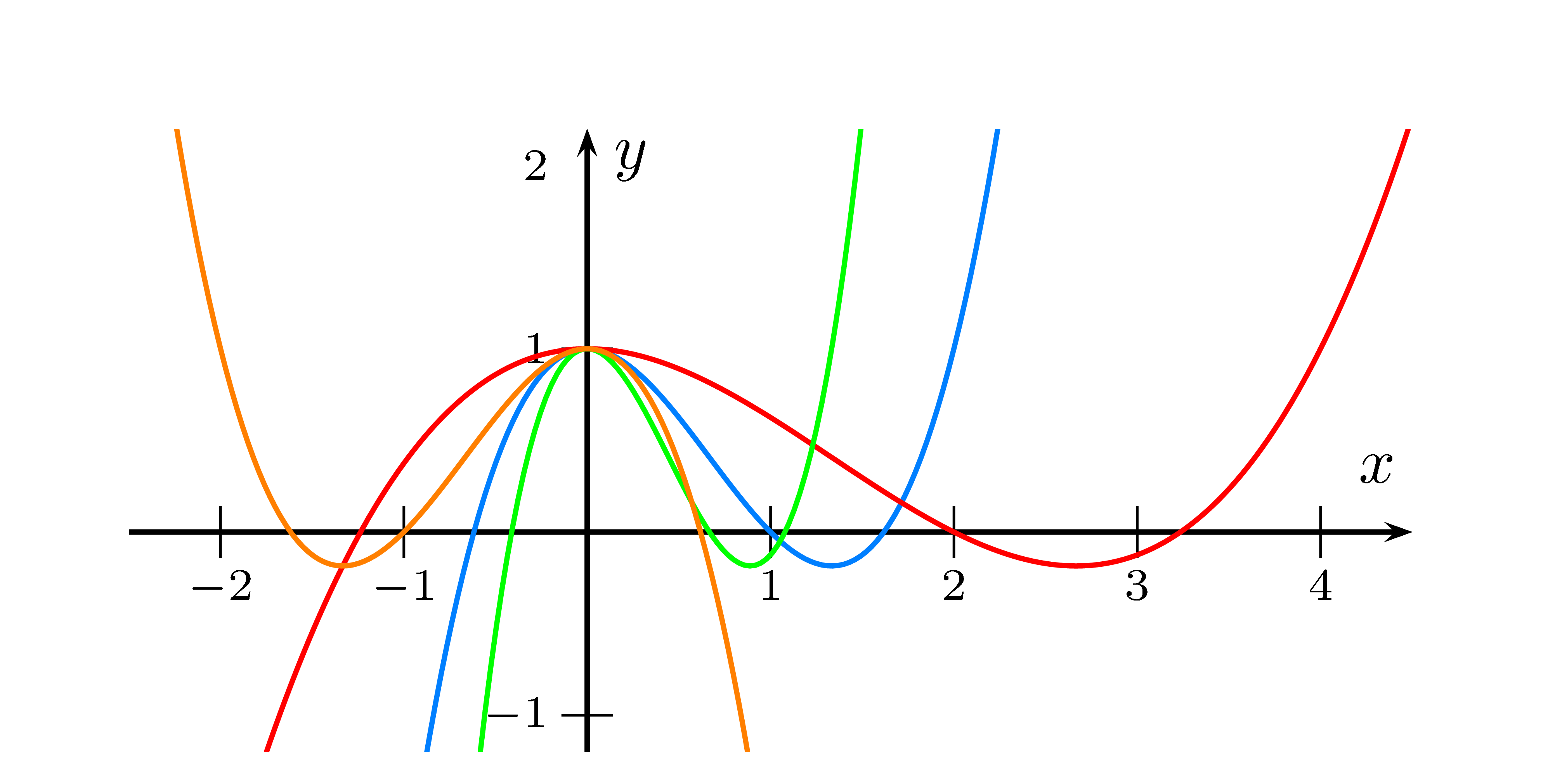 orange ist $f$ um -1 gesteckt (also gespiegelt) $f(x)=(-1x)^3-2(-1x)^2+1$