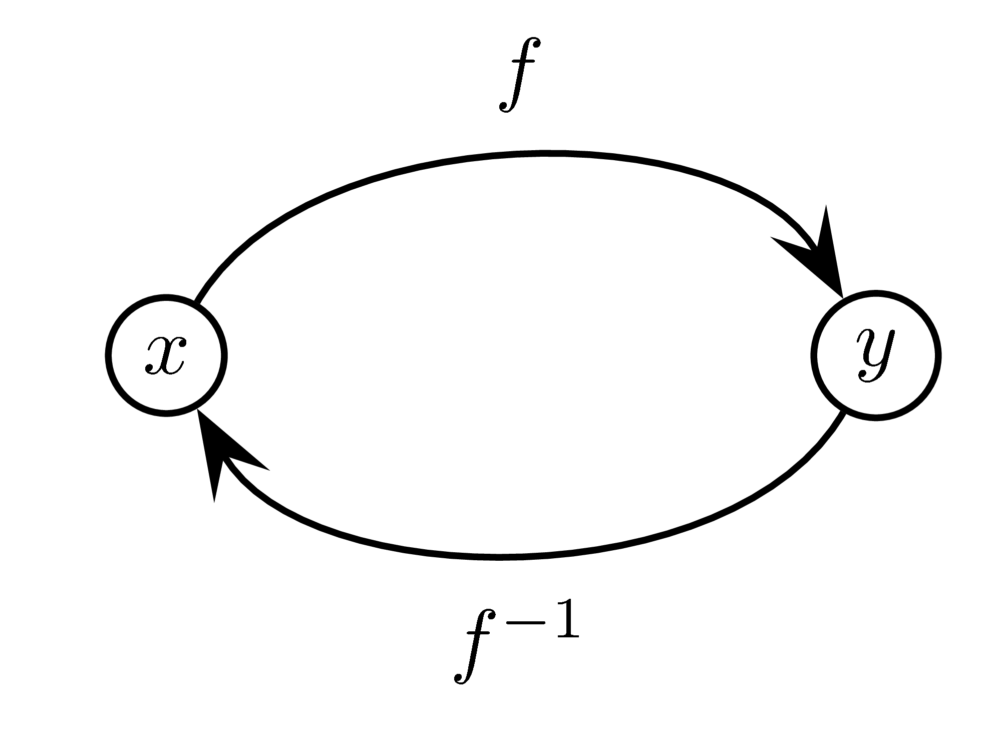 Da $f$ von $x$ nach $y$ abbildet und $f^{-1}$ von $y$ nach $x$, erhält man die