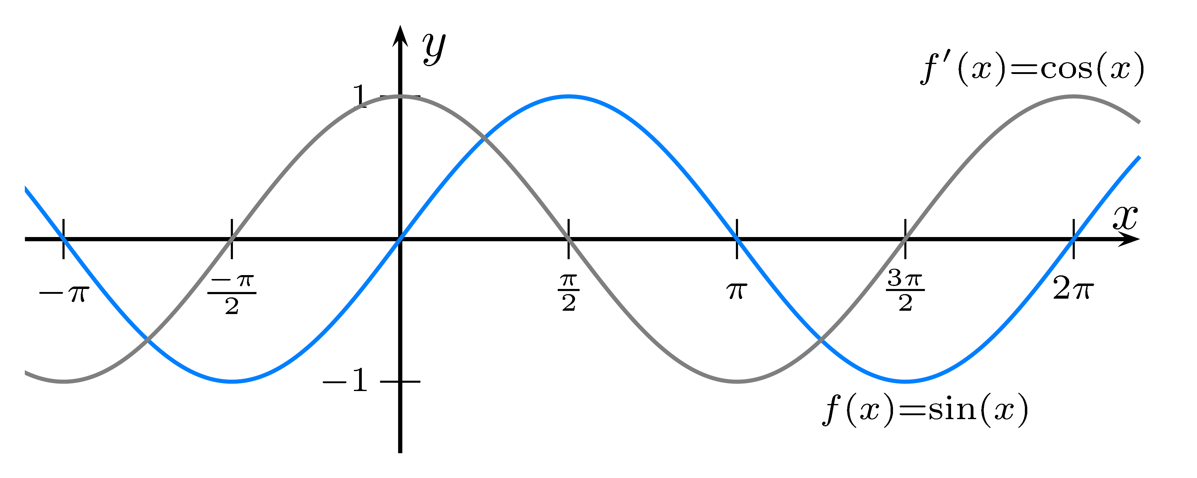 f(x)=\sin(x) & f'(x)=\phantom{-}\cos(x) \\\hline