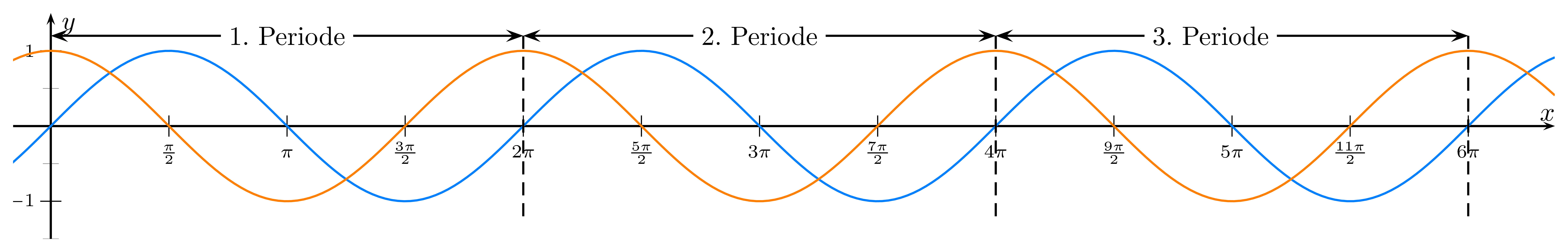 Die Periodenlänge von $\sin(x)$ und $\cos(x)$ ist $2\pi$.